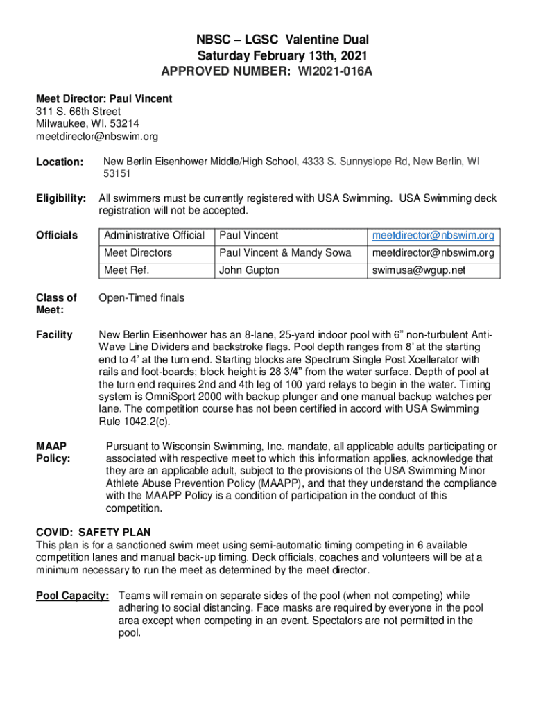 NTSC LSC Valentine Dual Saturday, February 13th, 2021 APPROVED NUMBER: WI2021016A Meet Director: Paul Vincent 311 S. 66th Street Milwaukee, WI. 53214 meetdirector@nbswim.org Location: Eligibility:Officials