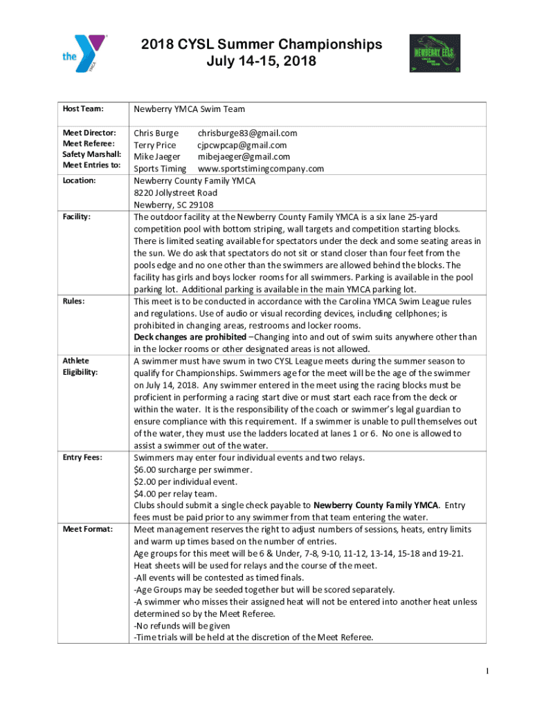 2018 CSL Summer Championships July 1415, 2018Host Team:Newberry YMCA Swim Teammate Director: Meet Referee: Safety Marshall: Meet Entries to:Chris Burke chrisburge83@gmail.com Terry Price cjpcwpcap@gmail.com