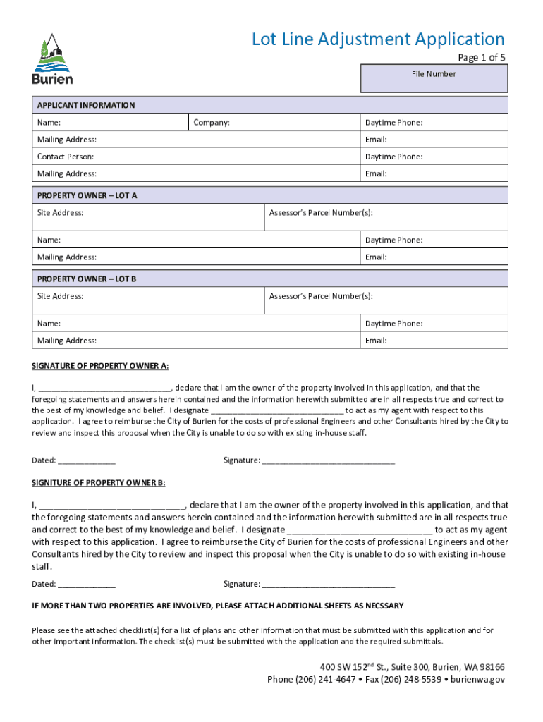 Lot Line Adjustment Application Page 1 of 5File Number APPLICANT INFORMATION Name:Company:Daytime Phone:Mailing Address:Email:Contact Person:Daytime Phone:Mailing Address:Email:PROPERTY OWNER LOT