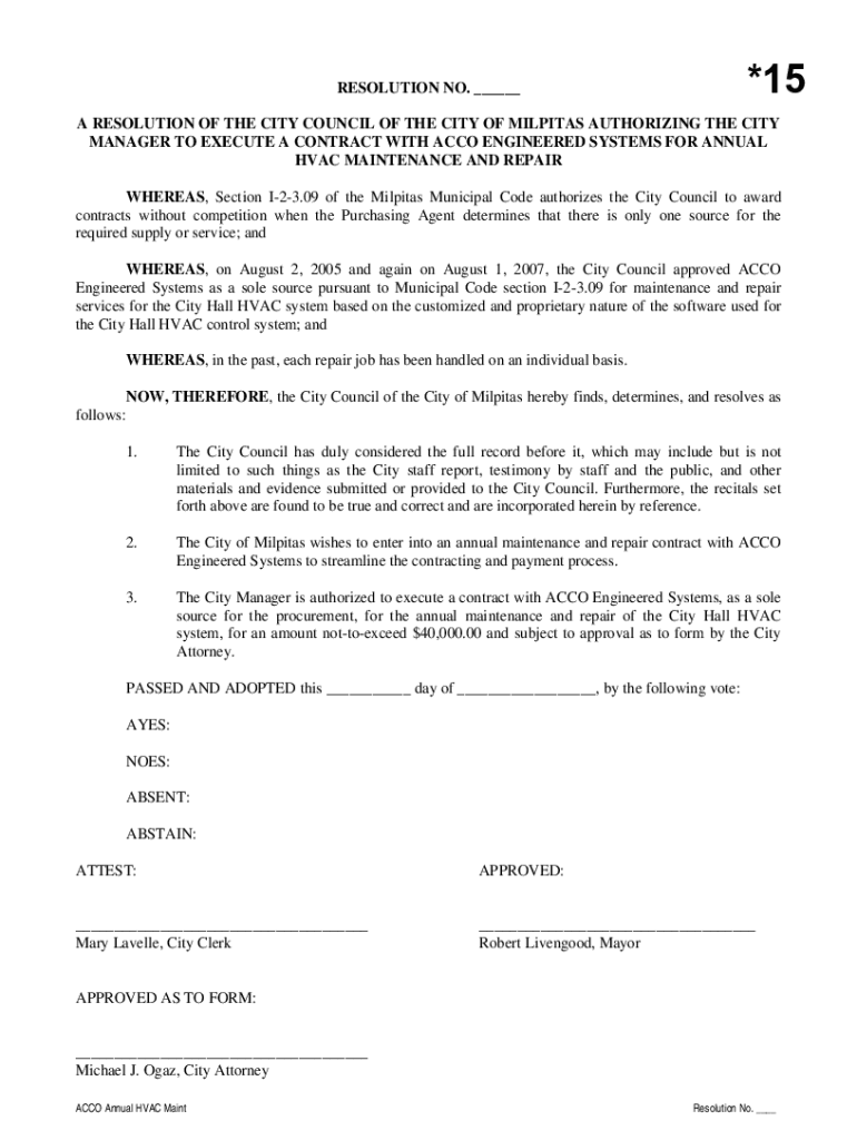 *15RESOLUTION NO. ___A RESOLUTION OF THE CITY COUNCIL OF THE CITY OF MILPITAS AUTHORIZING THE CITY MANAGER TO EXECUTE A CONTRACT WITH SACCO ENGINEERED SYSTEMS FOR ANNUAL HVAC MAINTENANCE AND REPAIR