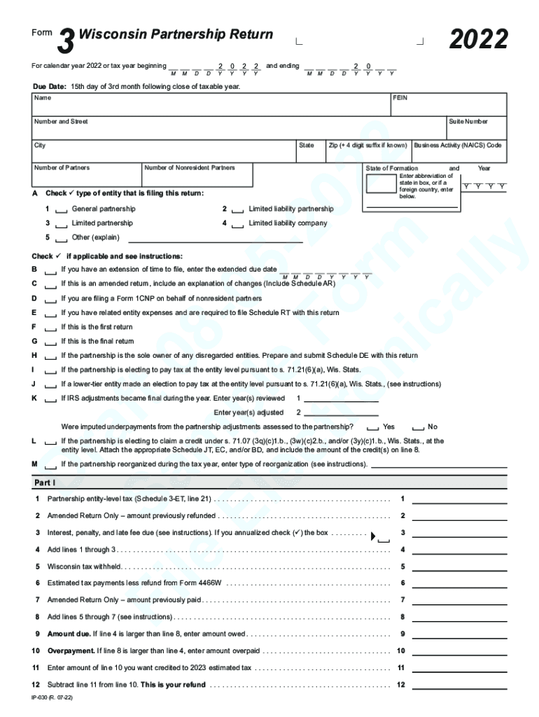 Form32022Wisconsin Partnership Returner calendar year 2022 or tax year beginningMMDD20YY2Y2Yand endingMMDD2Y0YYYDue Date: 15th day of 3rd month following close of taxable year. NameFEINNumber and