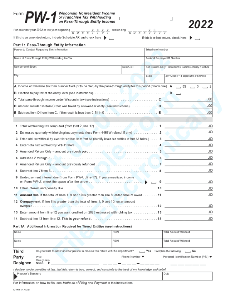 Get the free 2022 IC-004 Form PW-1 Wisconsin Nonresident Income or Franchise Tax Withholding on P...