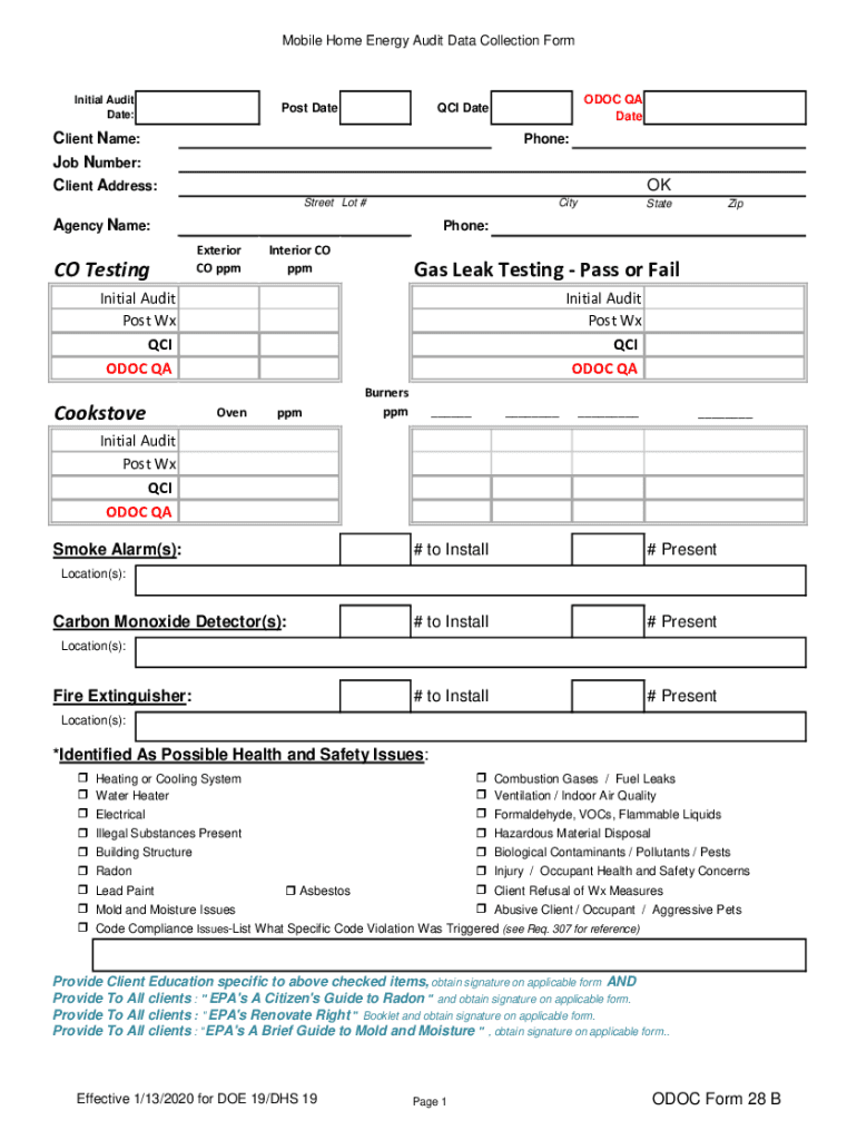 Mobile Home Energy Audit Data Collection FormInitial Audit Date:Post Dateline Name: Job Number: Client Address:Phone:OK Street Lot #CityAgency Name:CO TestingODOC QA Date DateZipPhone: Exterior CO