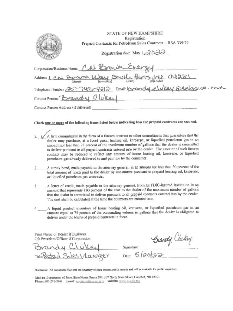 STATE OF NEW HAMPSHIRE Registration Prepaid Contracts for Petroleum Sales Contracts RSA 339:79 Registration due: May 1,0C Becca OT\” DVD\”\”(1/ CA\'Of ?:, co u XL.LI ::EU.& FAO ITF. Corporation/Business
