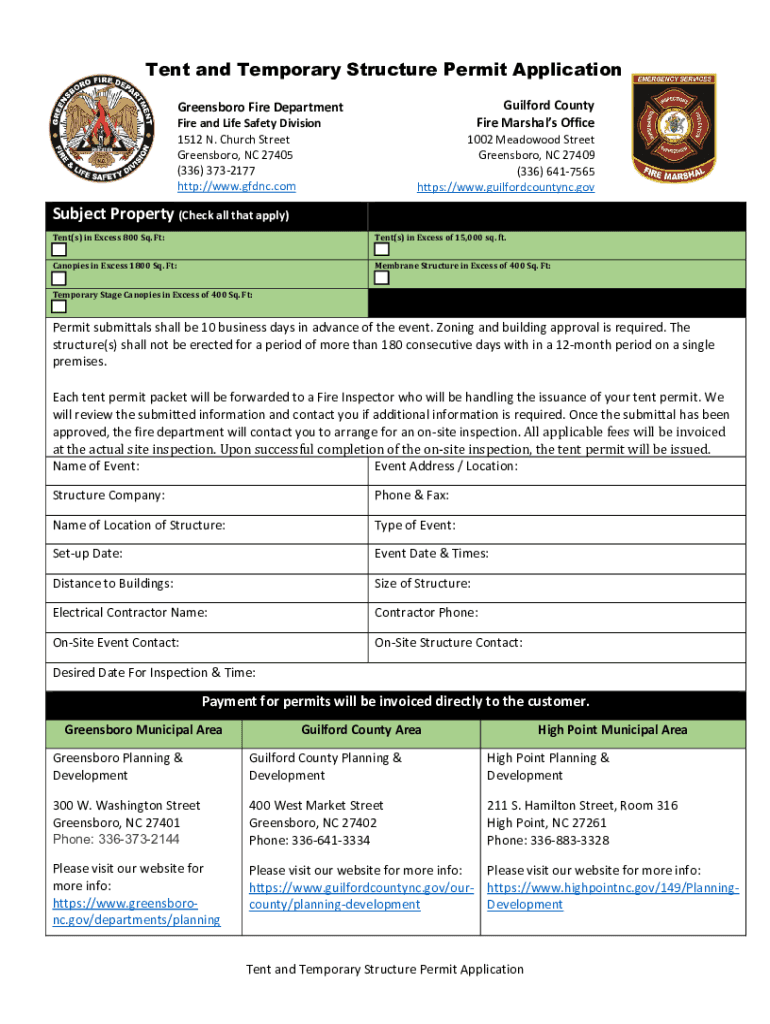 Tent and Temporary Structure Permit Application Guilford County Fire Marshals Office Greensboro Fire Department Fire and Life Safety Division 1512 N. Church Street Greensboro, NC 27405 (336) 3732177