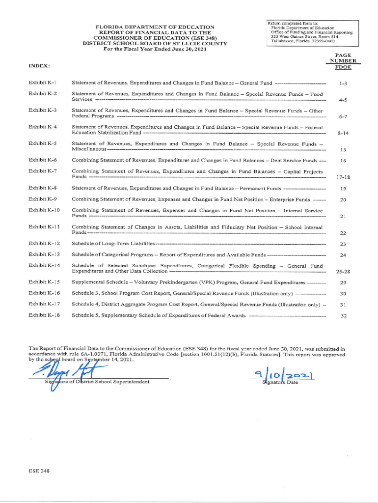 DISTRICT SCHOOL BOARD OF ST. LUCIE COUNTY STATEMENT OF REVENUES, EXPENDITURES AND CHANGES IN FUND BALANCE GENERAL FUND For the Fiscal Year Ended June 30, 2021, REVENUESExhibit K1 FOE Page 1 Fund 100