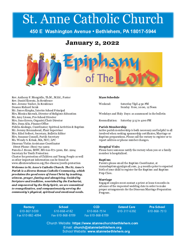 St. Anne Catholic Church St. Anne Catholic Church 450 E Washington Avenue Bethlehem, PA 180175944 3455 West Bangs Avenue Neptune, New Jersey 07753Rev. Anthony P. Monticello, The. M., M. Ed., Pastor