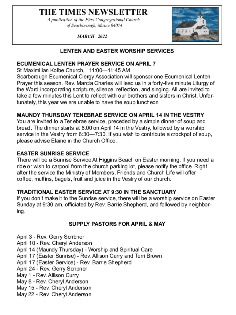 THE TIMES NEWSLETTER A publication of the First Congregational Church of Scarborough, Maine 04074 MARCH 2022LENTEN AND EASTER WORSHIP SERVICES ECUMENICAL LENTEN PRAYER SERVICE ON APRIL 7 St Maximilian