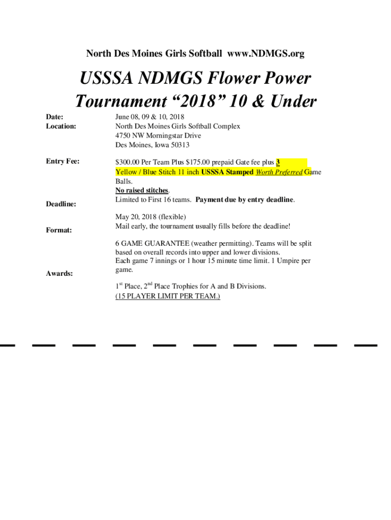 North Des Moines Girls Softball www.NDMGS.orgUSSSA ND MGS Flower Power Tournament 2018 10 & Under Date: Location:June 08, 09 & 10, 2018 North Des Moines Girls Softball Complex 4750 NW Morningstar