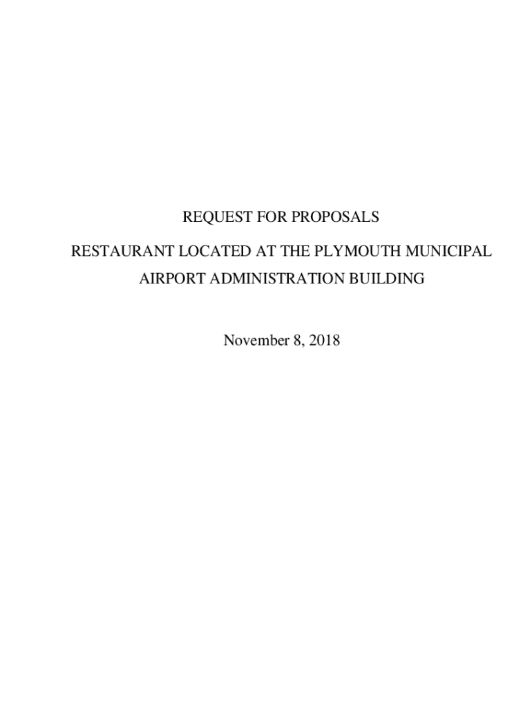 REQUEST FOR PROPOSALS RESTAURANT LOCATED AT THE PLYMOUTH MUNICIPAL AIRPORT ADMINISTRATION BUILDING November 8, 2018Request for Proposals The Plymouth Airport Commission, a municipal airport commission