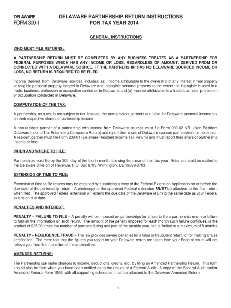 DELAWAREFORM 300IDELAWARE PARTNERSHIP RETURN INSTRUCTIONS FOR TAX YEAR 2014 GENERAL INSTRUCTIONS WHO MUST FILE RETURNS: A PARTNERSHIP RETURN MUST BE COMPLETED BY ANY BUSINESS TREATED AS A PARTNERSHIP
