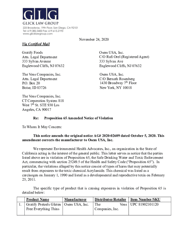 Get the free November 24, 2020 Via Certified Mail Gratify Foods Attn ... - oag ca