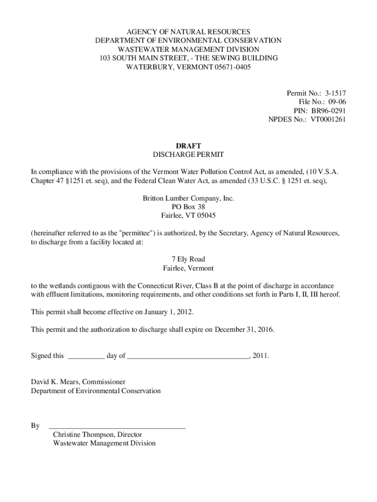 Get the free Britton Lumbar Company, Inc. Draft Permit VT0001261. This NPDES water permit was iss...