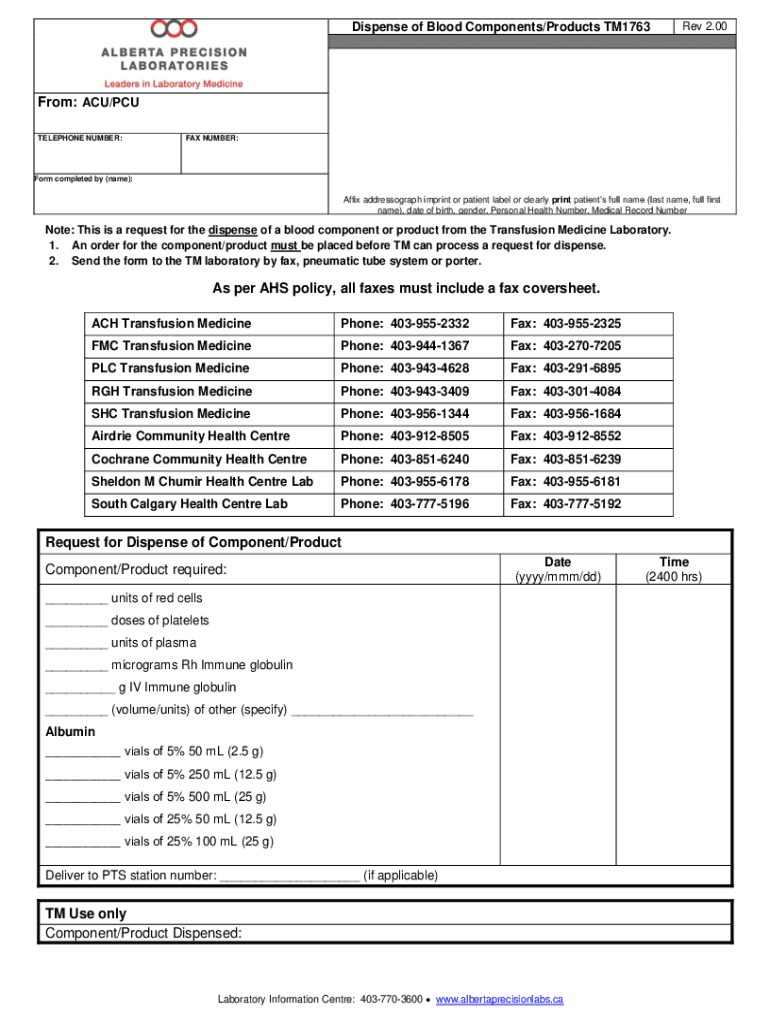 Dispense of Blood Components/Products TM1763Rev 2.00From: ACU/PCU TELEPHONE NUMBER:FAX NUMBER:Form completed by (name):Affix addressograph imprint or patient label or clearly print patients full name
