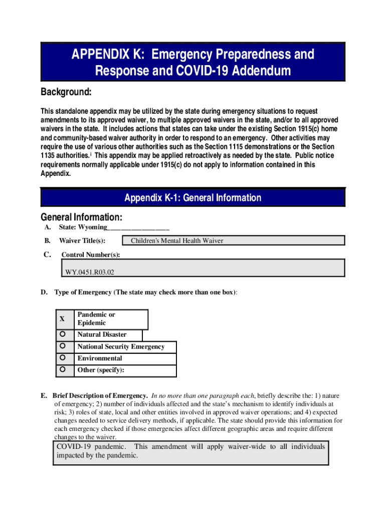 APPENDIX K: Emergency Preparedness and Response and COVID-19 Addendum Background: This standalone appendix may be utilized by the state during emergency situations to request amendments to its approved