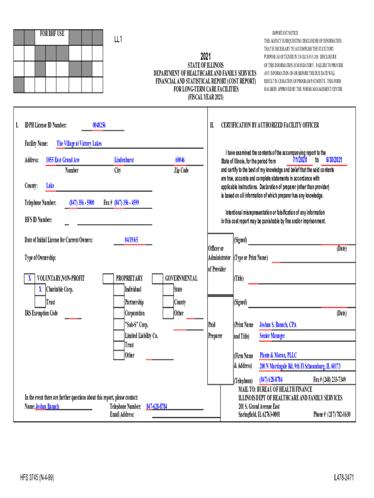 FOR BHF USELL1 2021STATE OF ILLINOIS DEPARTMENT OF HEALTHCARE AND FAMILY SERVICES FINANCIAL AND STATISTICAL REPORT (COST REPORT) FOR LONGER CARE FACILITIES (FISCAL YEAR 2021) I.DPH License ID Number: