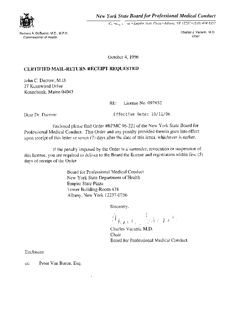 New York State Board for Professional Medical Conduct CL YUM, 1 RER Empire State Plaza Albany, NY 12237. (518) 4748357 ll Charles J. Vacant, M.D. Chair Barbara A. Cebuano, M.D., M.P.H Commissioner