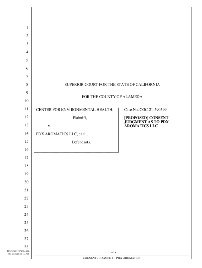1 2 3 4 5 6 7 8SUPERIOR COURT FOR THE STATE OF CALIFORNIA9 FOR THE COUNTY OF ALAMEDA 10 11CENTER FOR ENVIRONMENTAL HEALTH,12 13 14 15Plaintiff,Case No. CGC21590599 [PROPOSED] CONSENT JUDGMENT AS TO