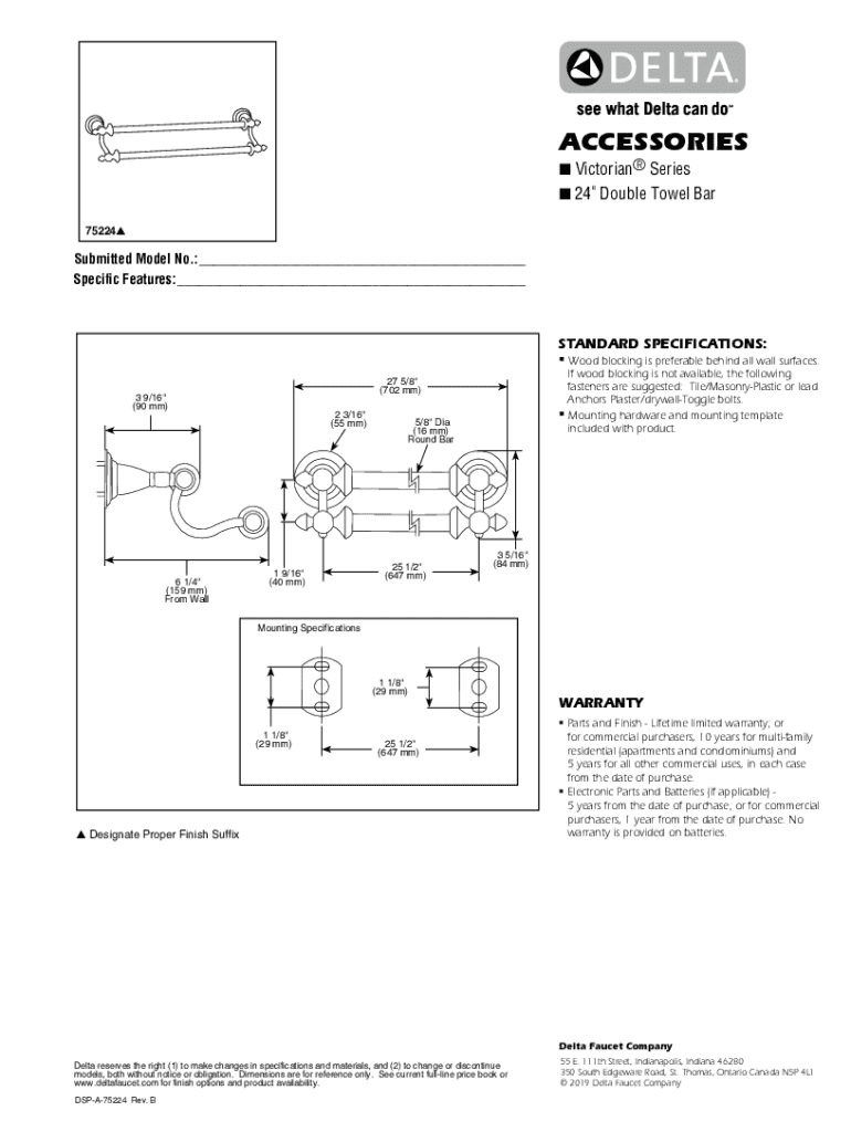 ACCESSORIES Victorian Series 24\” Double Towel Bar 75224Submitted Model No.:___ Specific Features:___STANDARD SPECIFICATIONS: Wood blocking is preferable behind all wall surfaces.3 9/16\” (90
