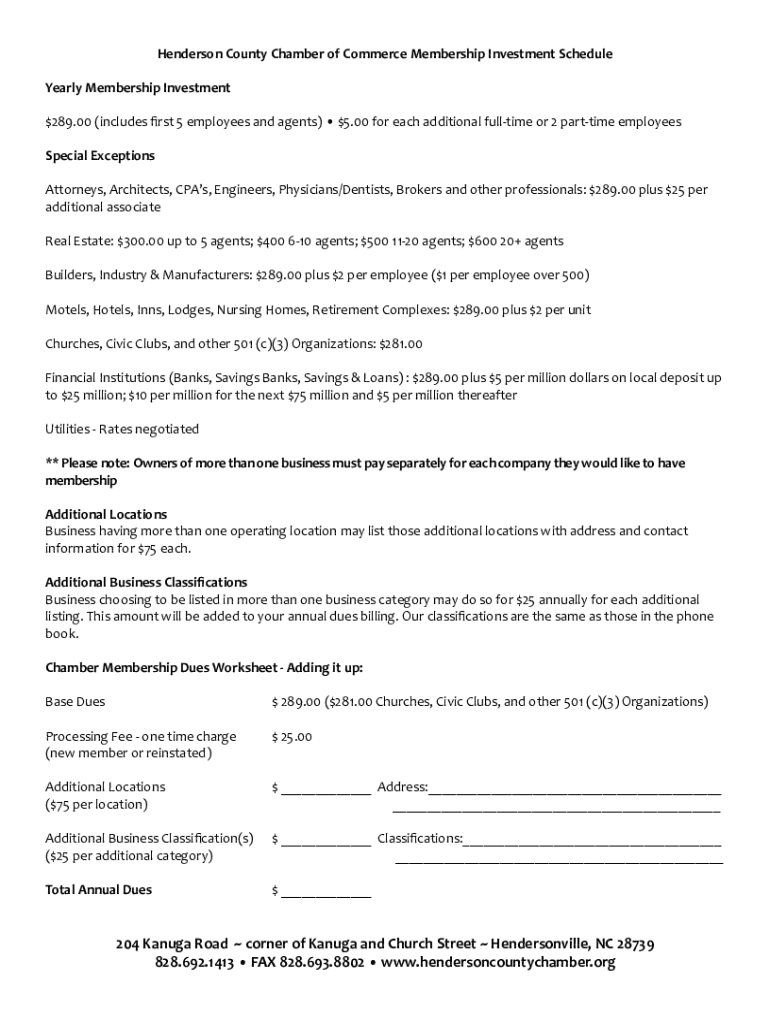 Henderson County Chamber of Commerce Membership Investment Schedule Yearly Membership Investment $289.00 (includes first 5 employees and agents) $5.00 for each additional full time or 2 part-time