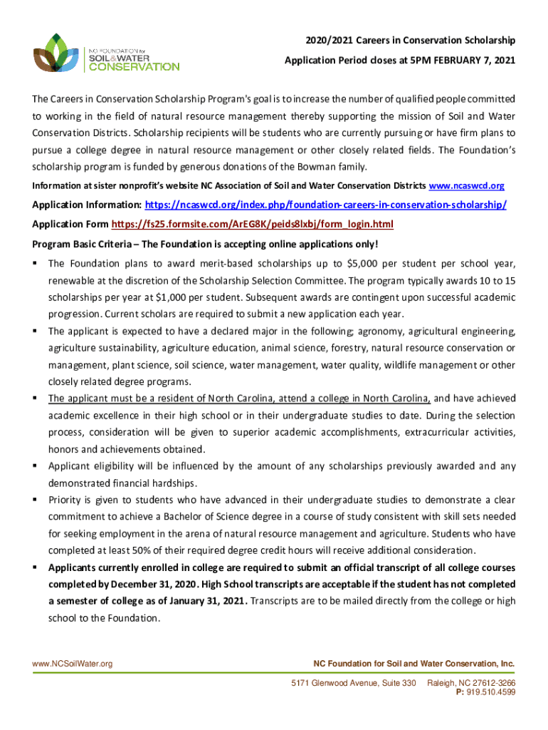 Get the free ncsoilwater.orgprogramscareers-in-conservationCareers in Conservation Scholarship Pr...