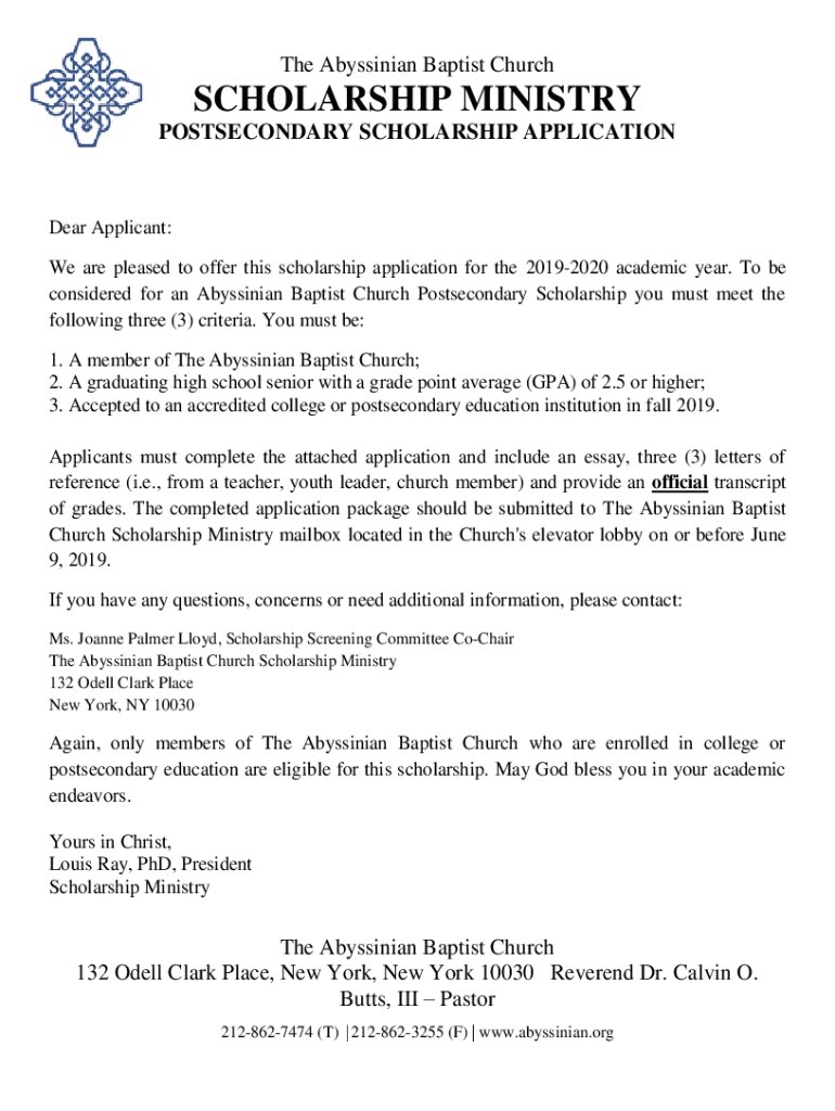The Abyssinian Baptist ChurchSCHOLARSHIP MINISTRY POSTSECONDARY SCHOLARSHIP APPLICATIONDear Applicant: We are pleased to offer this scholarship application for the 20192020 academic year. To be considered