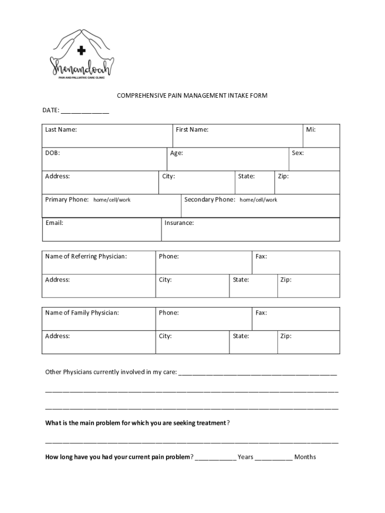COMPREHENSIVE PAIN MANAGEMENT INTAKE FORM DATE: ___ Last Name: DOB: Address:First Name: Age:Sex:City:Primary Phone: home/cell/work Email:Mi:State:Zip:Secondary Phone: home/cell/work Insurance:Name