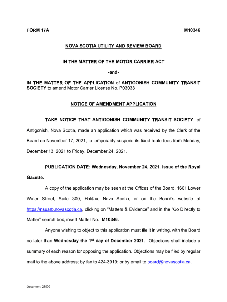 FORM 17AM10346 NOVA SCOTIA UTILITY AND REVIEW BOARD IN THE MATTER OF THE MOTOR CARRIER ACT and IN THE MATTER OF THE APPLICATION of ANTAGONIST COMMUNITY TRANSIT SOCIETY to amend Motor Carrier License