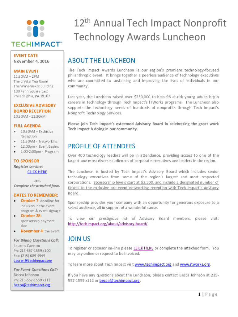 12th Annual Tech Impact Nonprofit Technology Awards Luncheon EVENT DATE November 4, 2016, MAIN EVENT 11:30AM 2PM The Crystal Tea Room The Wanamaker Building 100 Penn Square East Philadelphia, PA 19107EXCLUSIVE