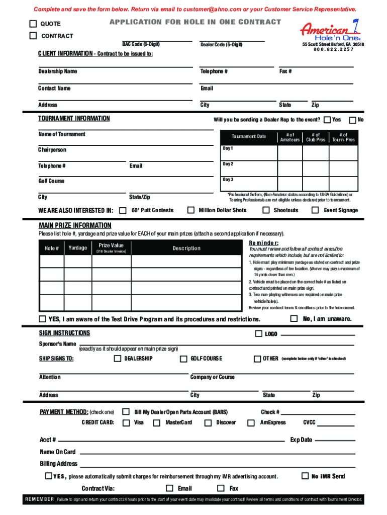 The GMC Hole In One Program Contract includes several notable features designed to aid dealerships in their participation. Key components of the form comprise fillable fields such as Dealership Name, Contact Information, and tournament details.