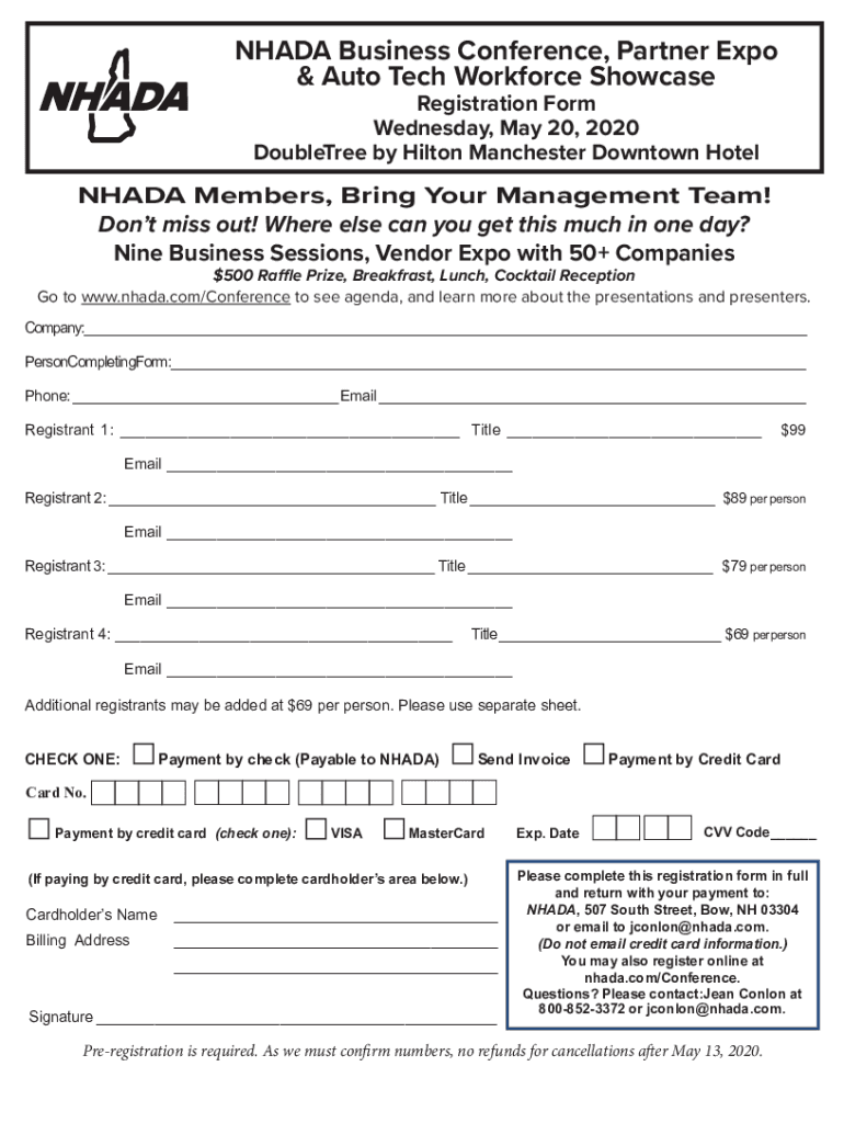 NH ADA Business Conference, Partner Expo & Auto Tech Workforce Showcase Registration Form Wednesday, May 20, 2020, Doublet by Hilton Manchester Downtown HotelNHADA Members, Bring Your Management Team!