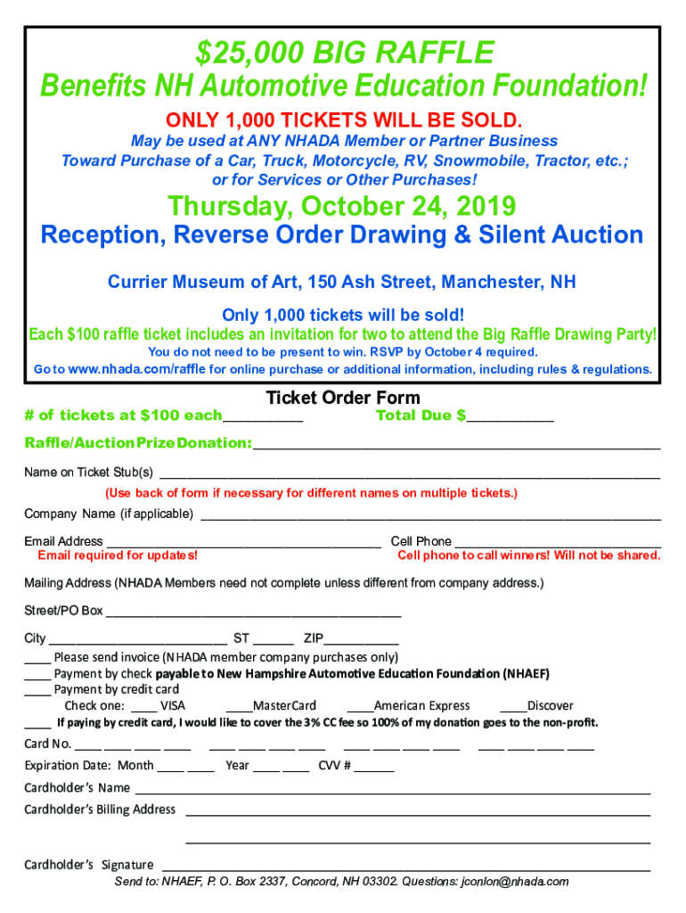 $25,000 BIG RAFFLE Benefits NH Automotive Education Foundation! ONLY 1,000 TICKETS WILL BE SOLD. May be used at ANY NH ADA Member or Partner Business Toward Purchase of a Car, Truck, Motorcycle, RV,