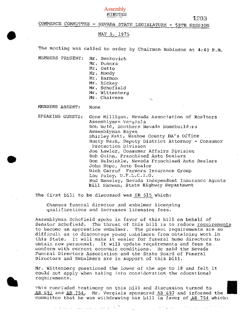 Assembly MINUTES1203COMMERCE COMMITTEE NEVADA STATE LEGISLATURE 58TH SESSION MAY 5, 1975, The meeting was called to order by Chairman Robinson at 4:40 P.M. MEMBERS PRESENT:Mr. Mr. Mr. Mr. Mr. Mr.