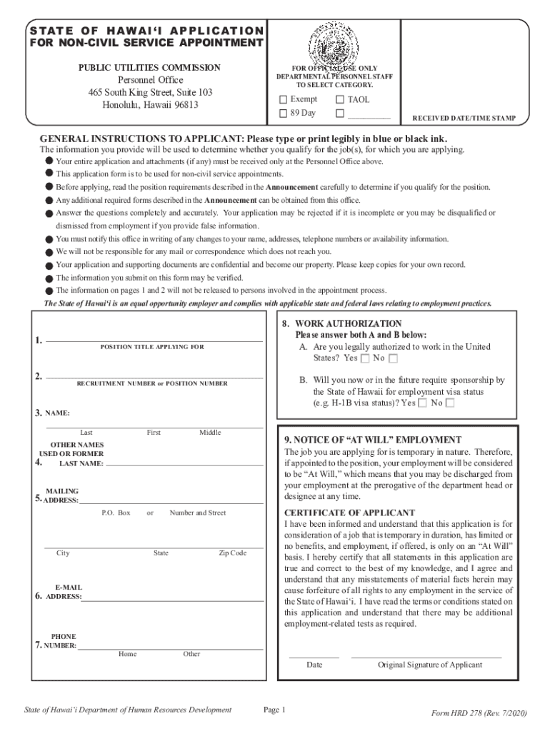 S TAT E O F H A W A I I A P P L I C AT I O N FOR UNCIVIL SERVICE APPOINTMENT PUBLIC UTILITIES COMMISSIONPersonnel Office 465 South King Street, Suite 103 Honolulu, Hawaii 96813FOR OFFICIAL USE ONLY