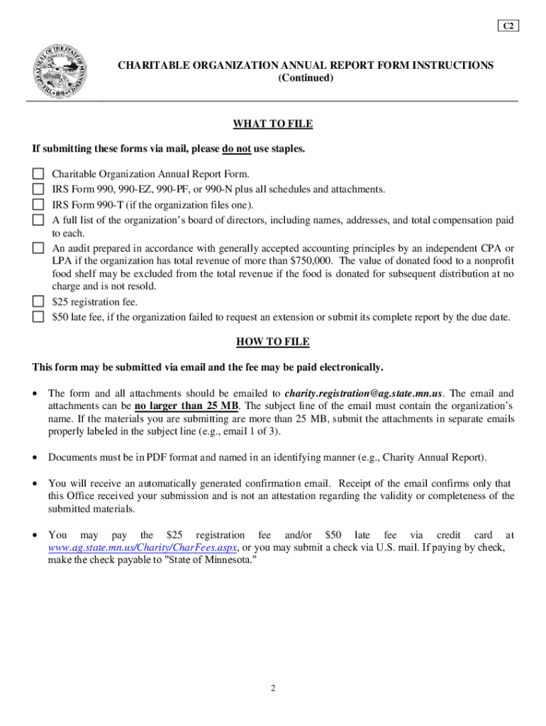 C2Mail To: Minnesota Attorney Generals Office Charities Division 445 Minnesota Street, Suite 1200 St. Paul, MN 551012130 Website Address: www.ag.state.mn.us/charitySTATE OF MINNESOTA CHARITABLE ORGANIZATION