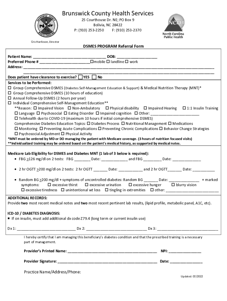 Brunswick County Health Services 25 Courthouse Dr. NE; PO Box 9 Bolivia, NC 28422 P: (910) 2532250 F: (910) 2532370Cris Harrelson, Directories PROGRAM Referral Formation Name: ___ DOB: ___ Preferred