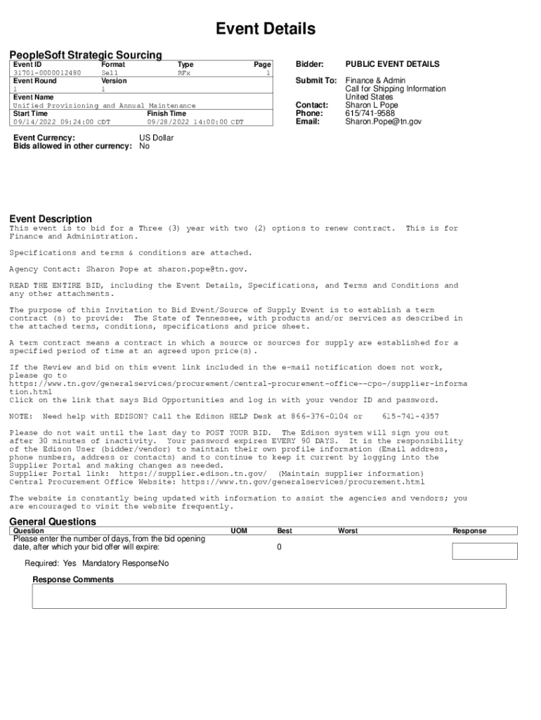 Event Details People Soft Strategic Sourcing Event ID Format Type 317010000012480 Sell Rex Event Round Version 1 1 Event Name Unified Provisioning and Annual Maintenance Start Time Finish Time 09/14/2022