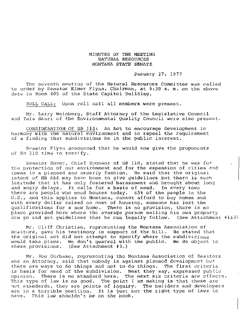 MINUTES O F THE MEETING NATURAL RESOURCES MONTANA STATE SENATE J an n u an r y 2 7, 1977 The s e v e n t h m e e t i n g o f t h e N a t u r an l R e s o u r c e s Committee was c an l e d t o o r