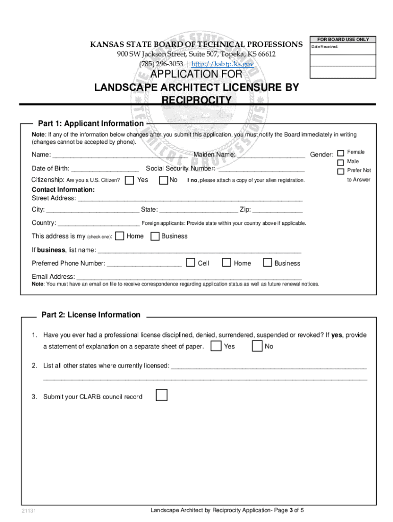 KANSAS STATE BOARD OF TECHNICAL PROFESSIONS 900 SW Jackson Street, Suite 507, Topeka, KS 66612 (785) 2963053 | http://ksbtp.ks.govAPPLICATION FOR LANDSCAPE ARCHITECT LICENSURE BY RECIPROCITY INSTRUCTIONS