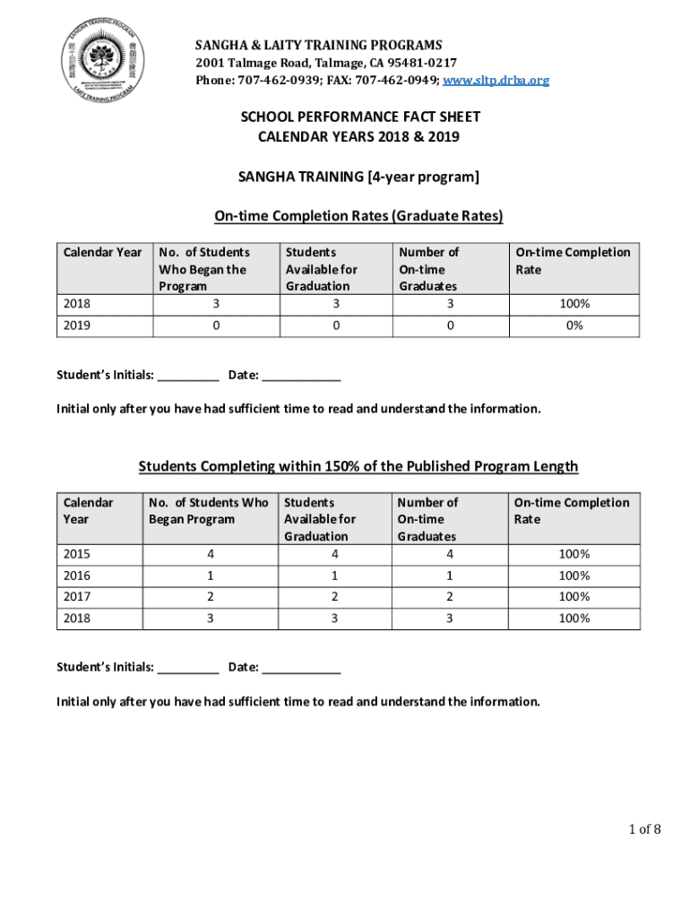 SAN GHA & LAITY TRAINING PROGRAMS2001 Talmadge Road, Talmadge, CA 954810217Phone: 7074620939; FAX: 7074620949; www.sltp.drba.orgSCHOOL PERFORMANCE FACT SHEET CALENDAR YEARS 2018 & 2019 SAN GHA TRAINING