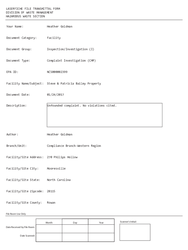 LASERFICHE FILE TRANSMITTAL FORM DIVISION OF WASTE MANAGEMENT HAZARDOUS WASTE SECTION Your Name:Heather GoldmanDocument Category:FacilityDocument Group:Inspection/Investigation (I)Document Type:Complaint