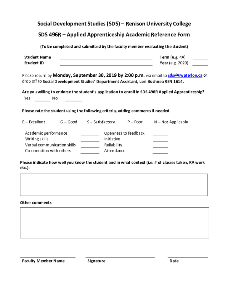 Social Development Studies (SDS) Venison University College SDS 496R Applied Apprenticeship Academic Reference Form (To be completed and submitted by the faculty member evaluating the student) Student