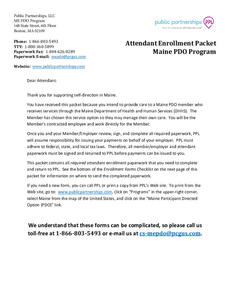 Public Partnerships, LLC ME PDO Program 148 State Street, 6th Floor Boston, MA 02109 Phone: 18668035493 TTY: 18003605899 Paperwork Fax: 18446260289 Paperwork Email: mepdo@pcgus.comAttendant Enrollment