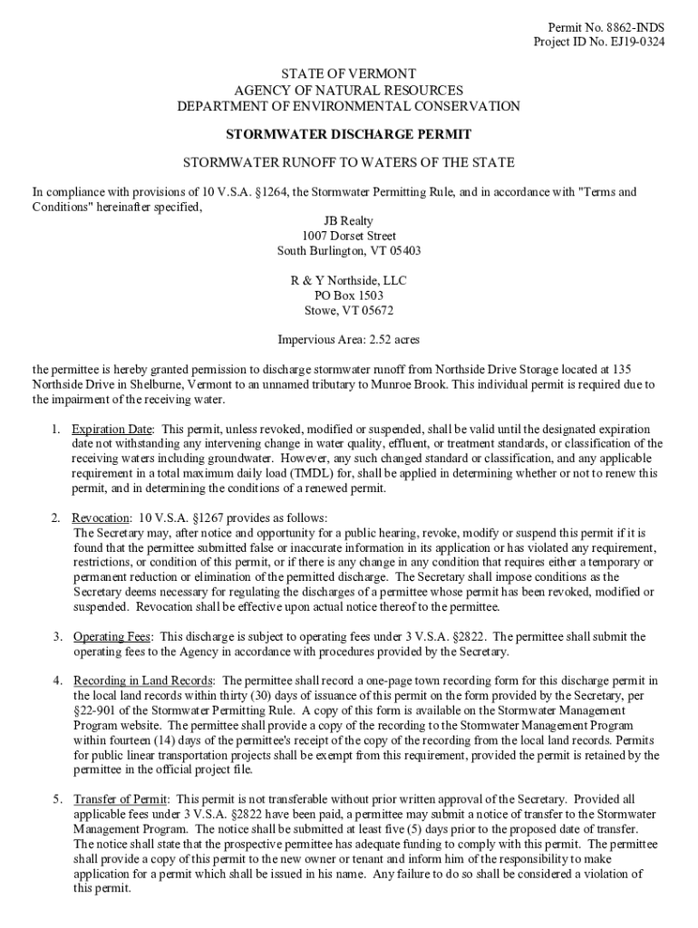 Permit No. 8862INDS Project ID No. EJ190324STATE OF VERMONT AGENCY OF NATURAL RESOURCES DEPARTMENT OF ENVIRONMENTAL CONSERVATION STORMWATER DISCHARGE PERMIT STORMWATER RUNOFF TO WATERS OF THE STATE