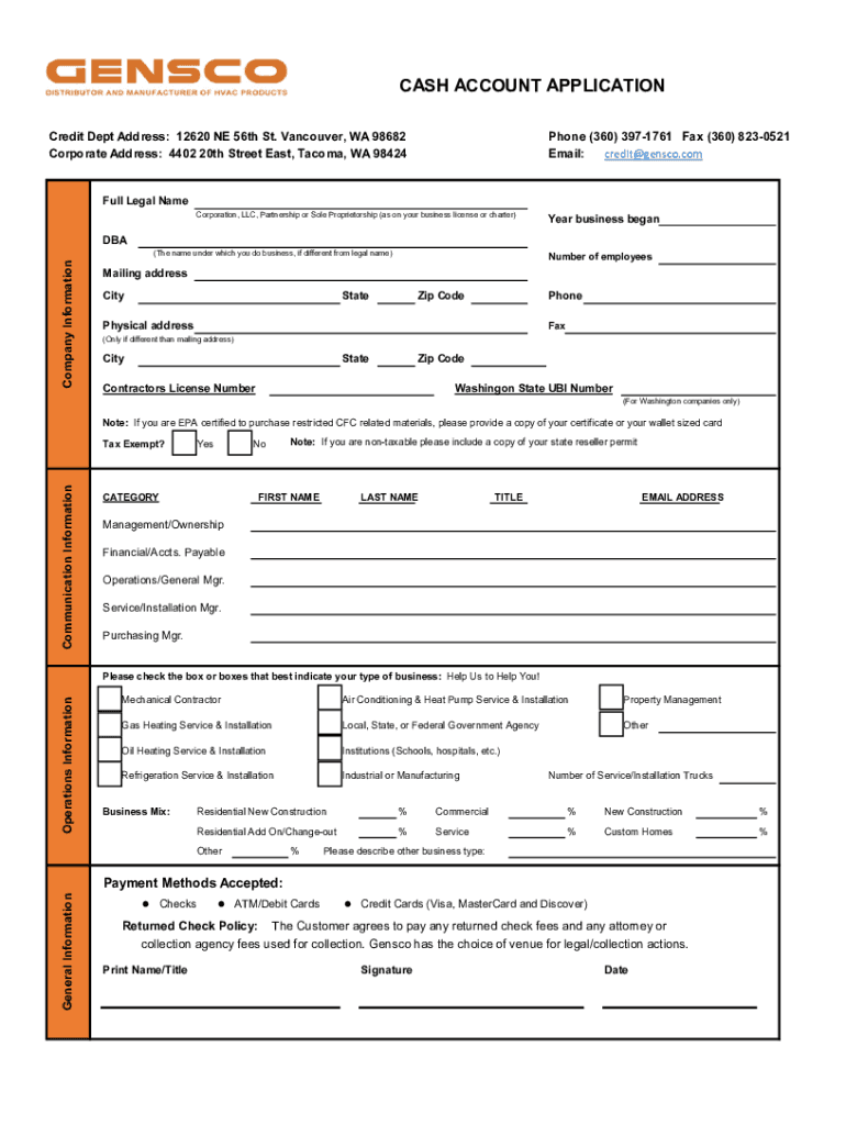 CASH ACCOUNT APPLICATION Credit Dept Address: 12620 NE 56th St. Vancouver, WA 98682 Corporate Address: 4402 20th Street East, Tacoma, WA 98424Phone (360) 3971761 Fax (360) 8230521 Email: credit@gensco.comFull