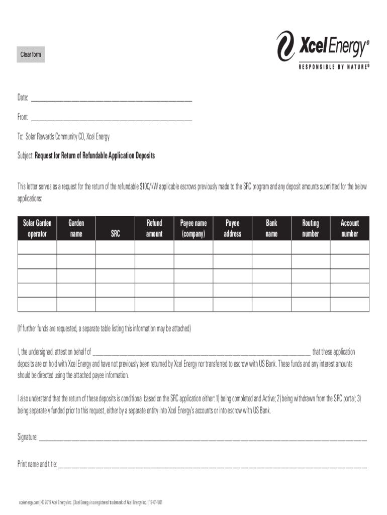 Clear format: ___ From: ___ To: Solar Rewards Community CO, Excel Energy Subject: Request for Return of Refundable Application Deposits This letter serves as a request for the return of the refundable
