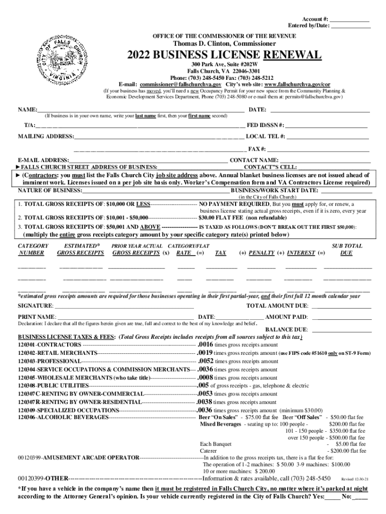Account #: ___ Entered by/Date: ___ OFFICE OF THE COMMISSIONER OF THE REVENUE Thomas D. Clinton, Commissioner2022 BUSINESS LICENSE RENEWAL 300 Park Ave, Suite #202W Falls Church, VA 220463301 Phone: