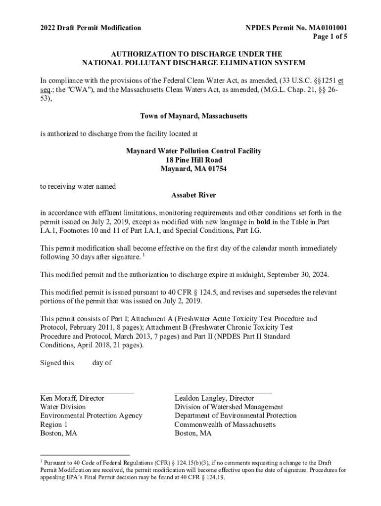 2022 Draft Permit ModificationNPDES Permit No. MA0101001 Page 1 of 5AUTHORIZATION TO DISCHARGE UNDER THE NATIONAL POLLUTANT DISCHARGE ELIMINATION SYSTEM In compliance with the provisions of the Federal