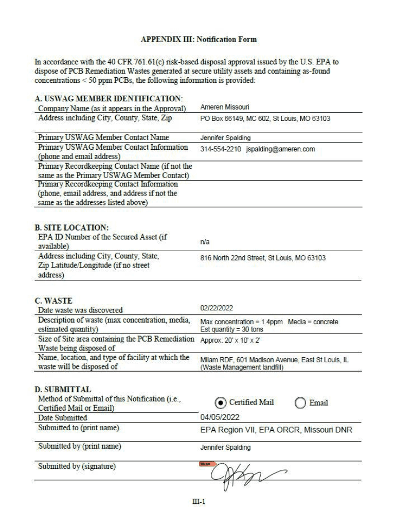 APPENDIX ill: Notification Form FM accordance with the 40 CFR 761.6J(c) risk based disposal approval issued by the U.S. EPA to dispose of PCB Remediation Wastes generated at secure utility assets