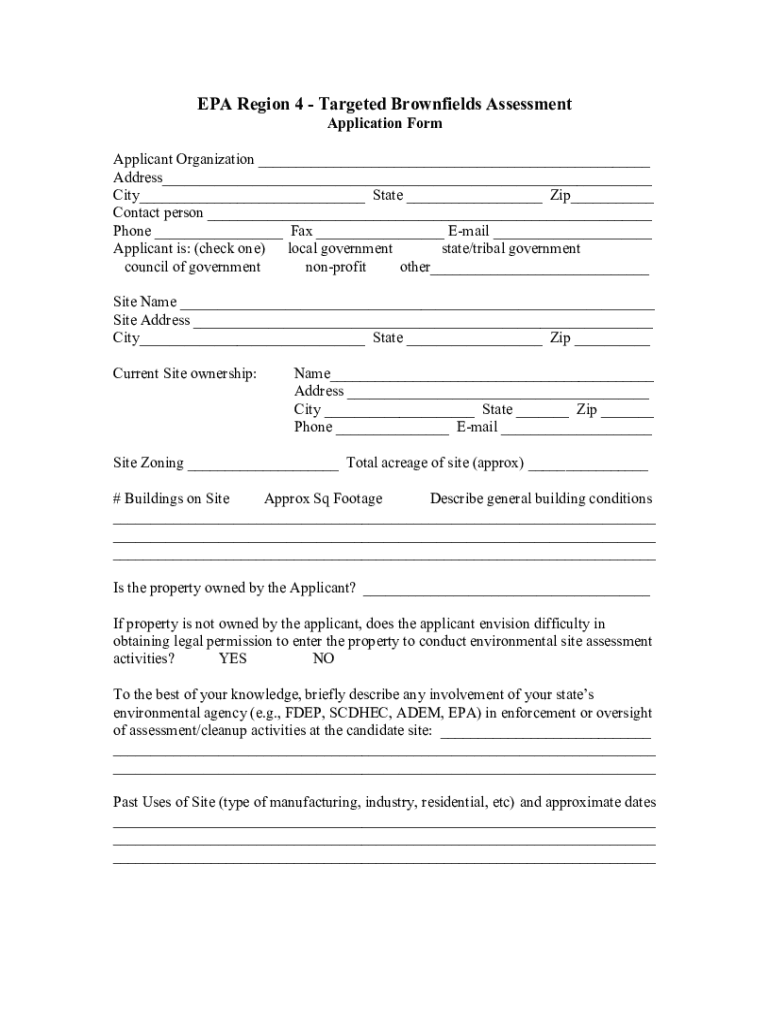 EPA Region 4 Targeted Brownfield Assessment Application Form Applicant Organization ___ Address___ City___ State ___ Zip___ Contact person ___ Phone ___ Fax ___ Email ___ Applicant is: (check one)